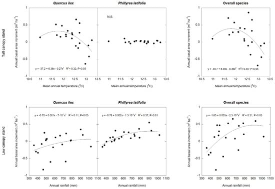 Polynomial regression analysis of total annual basal area increase (TBAI) and mean annual temperature in the tall canopy stand and total annual rainfall in the low canopy stand, for Q. ilex, P. latifolia, and all of the tree and shrub species. n = 21 years.