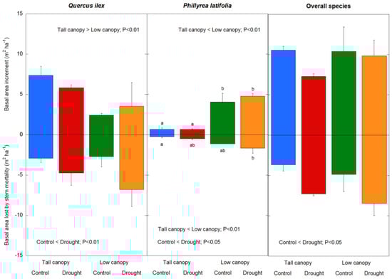 Drought treatment and canopy stand type effects on basal area increment (BAI) and basal area lost by stem mortality (BAL) in Q. ilex, P. latifolia, and all of the tree and shrub species during the study period (1999–2019). Vertical bars indicate the standard error of the mean (n = 21 years). Different letters indicate drought treatment differences between and within the canopy stand types (p < 0.05).