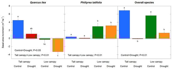 Drought treatment and canopy stand type effects on total basal area increment (TBAI) in Q. ilex, P. latifolia, and all of the tree and shrub species during the study period (1999–2019). Vertical bars indicate the standard error of the mean (n = 21 years). Different letters indicate drought treatment differences between and within the canopy stand types (p < 0.05).