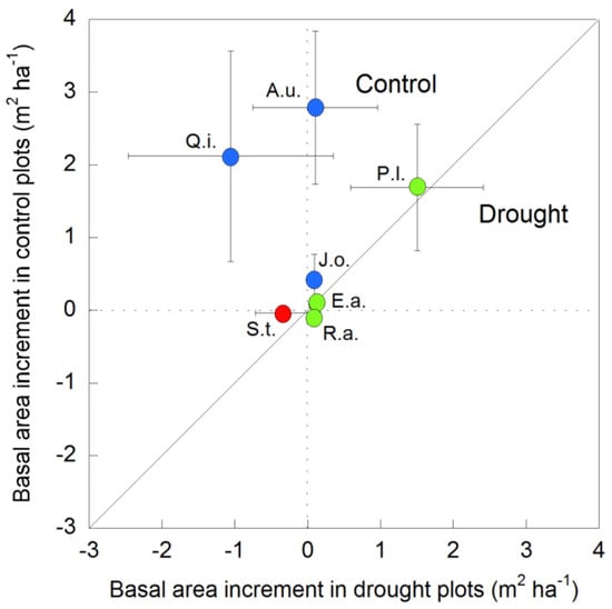 Total basal area increment (TBAI) of the most representative forest tree and shrub species under full (control) and partial (drought) rainfall conditions during the study period (1999–2019). Vertical and horizontal bars indicate the standard error of the mean (n = 21 years). Species with a higher TBAI in control plots than in drought plots are depicted with blue circles, species with a similar TBAI in both control and drought plots are depicted with green circles, and the species with a negative TBAI in both the control and drought plots are depicted with a red circle. Q.i. means Quercus ilex, A.u. means Arbutus unedo, J.o. means Juniperus oxycedrus, P.l. means Phillyrea latifolia, E.a. means Erica arborea, R.a. means Rhamnus alaternus, and S.t. means Sorbus torminalis.