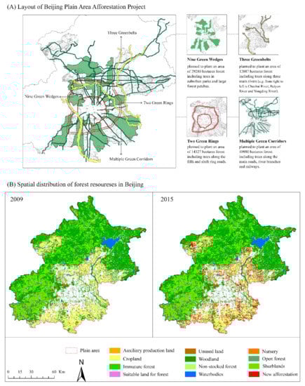 - Beijing Gardening and Greening Bureau. Beijing Plain Afforestation Program. Available online: http://www.bjyl.gov.cn/sdlh/bjs20wmzlgc/ (accessed on 10 January 2018).
