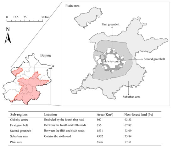 Plain area location and sub-regions. Proportion of non-forest was based on the Beijing Forestry Inventory (2009), and the non-forest land included cropland, other land, unused land, and waterbodies [84].