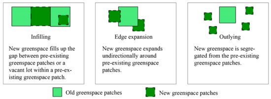 Diagrammatic illustration of three landscape expansion models adapted from Forman and Liu [67,87]. The greenspace expansion belongs to infilling, edge expansion, and outlying mode when LEI ≥ 0.5, < 0.5, and 0, respectively.
