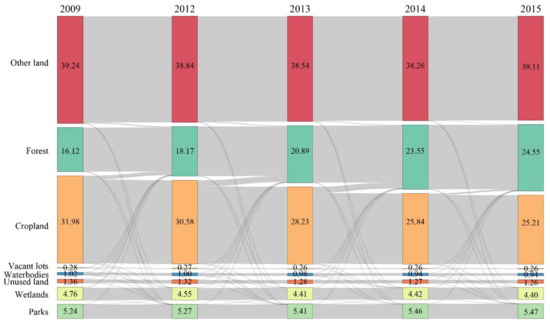 The stacked bars in the Sankey diagram (Figure 4) represented the relative proportion of patch mosaics, showing that other lands (including urban built-up areas and other impervious surfaces) followed by cropland were the dominant patch type in the plain area, with an area decreased by 1.13% and 6.77% from 2009 to 2015, respectively. Forest was the third most dominant patch mosaic, and its area increased by 8.43% after afforestation, with the largest annual increase in urban forest area occurring between 2012 and 2014. Specifically, the transition rates of forest area reached 14.94% and 12.73% in the period of 2012−2013 and 2013−2014, respectively (Appendix A, Table A1). After BPAP implementation, parks showed a minimal increase (0.23%), while wetlands decreased (0.36%). The area of waterbodies and vacant lots slightly decreased from 2009 to 2015 (0.08% and 0.02%, respectively).