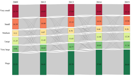 To identify and describe the conversion of landscape types and their patch size, a landscape transition matrix was used to measure the amounts of different patch types and their size changes in corresponding period (i.e., 2009−2012, 2012−2013, 2013−2014, 2014−2015) [92]. To detect the growth of greenspace patch size, we divided the patch size into six levels: (1) very small, (2) small, (3) medium, (4) large, (5) very large, and (6) huge (<10, 10–30, 30–50, 50–100, 100–200, >200 ha, respectively) before creating the patch-size transition matrices [53,93]. As the total number of greenspace patches varied among periods, and thus the total landscape areas (i.e., the number of pixels in the maps) were different, we detected the transitions in the proportion of land area for each patch-size class instead. Finally, a Sankey diagram was used to visualize the four-period transition matrices of landscape types and greenspace patch size from 2009 to 2015 [94]. Sankey diagrams were created using the networkD3 package in RStudio 3.6.1 [95].