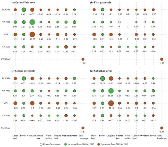Changes in class-, i.e., percentage of landscape (PLAND, an increased value indicates the relative increased area of corresponding patch type), number of patches (NP, if the total area of corresponding patch type is held constant or decreasing, an higher value indicates higher fragmentation), mean patch size (MPS, an increased value indicates less fragmentation), area weighted mean shape index (AWMSI, an increased value indicates the patch shapes become more irregular), and landscape-level, i.e., contagion (CONTAG, an decreased value indicates the distribution of all patches become more fragmented), indices from 2009 to 2015 in the entire plain area (a), the first greenbelt (b), the second greenbelt (c) and the subregion area (d). The vertical and horizontal axes indicated the landscape indices and patch types, respectively; dot size represented the absolute value of change; green and brown indicated increase and decease, respectively, while white indicated no change from 2009 to 2015; dots with black outlines indicated urban greenspace (i.e., forest, parks, wetlands, vacant lots). The value of change was indicated below each dot.