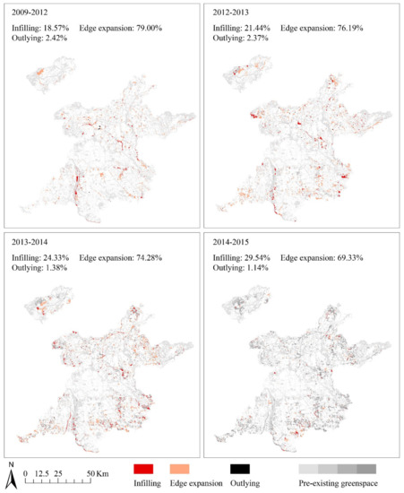 Maps of urban greenspace landscape expansion types (i.e., infilling, edge expansion, outlying) in 240 m distances during the process of afforestation in 2009−2013, 2012−2013, 2013−2014, 2014−2015. The proportions of each landscape expansion type were also listed on the top of each panel.