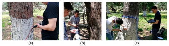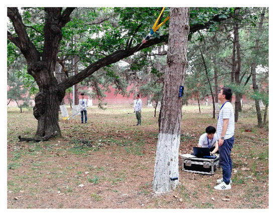 In general, detection of historic trees focuses on three aspects including growth condition, trunk defects, and tree stability. Visual inspection of historic trees is an effective way to assess growth conditions by investigating four indicators like the condition of leaves, branches, trunks, and roots. According to Chinese standards, historic trees should be classified as healthy, weakened, severely weakened, or endangered by assigning a certain weight to the four indicators mentioned above based on their actual conditions [5,6]. Trunk defect detection is an important part of tree evaluation, and a combination method of probe detection and wave detection is commonly used. Resistograph, as a probe inspection method, can reveal wood quality based on the resistance of the probe, and this approach has been widely used to detect internal defects within tree trunks, as some studies demonstrated there was a strong correlation between resistance of the probe and density of wood material [7,8,9,10,11,12,13]. Wave detection methods based on stress wave or radar wave all can be used for NDT of tree trunk’s internal defects. There are two detection methods related to the stress wave, which are the stress wave transmission velocity method and stress wave tomography. The difference between them is that the former is a single channel while the latter is a multi-channel. The stress wave transmission velocity method can judge the status of the trunk according to the radial wave velocity, which is obtained by measuring the trunk with a stress wave timer. It is a simple and fast NDT method, which is widely used in the rapid screening of internal defects of a standing tree’s trunks. Stress wave tomography is a visual defect image compounded from the stress wave transmission velocity method of multiple paths using stress wave tools within a section of the trunk, and multiple plane images of different heights can even form a three-dimensional image of defects [14]. Time-of-flight ultrasonic wave inspection is also used to detect the internal defects of tree trunks due to the high correlation between the ultrasonic propagation speed and the density as well as elastic modulus of the propagation medium, but it is still mainly in the stage of a laboratory demonstration [15]. Ground-penetrating radar (GPR) based on radar waves can be used to detect defects within the trunk and root distribution, and the detection of root distribution has the most interest to researchers. However, intensive research is required to carry out to obtain convincing results using this method [16]. There are a few methods for detecting the stability of trees. The pulling test is one of the few effective methods to detect the tree anchorage [17,18,19], and the destructive pulling test shows that there is a high correlation between tree anchorage and diameter at breast height (DBH) as well as tree height (H) [20]. In addition, some researchers conducted non-destructive pulling test studies to predict the tree anchorage. Some predictive results have been obtained as well [21,22,23].