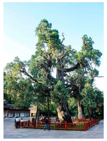 The Mausoleum of Huangdi with a history of over 5000 years is located in Yan’an City, Shaanxi Province, China. There are more than 81,600 Chinese arborvitaes. Among them, as many as 30,000 cypresses are over 1000 years old. In 2013, the conservation and rehabilitation of ancient Chinese arborvitaes in the Huangdi Mausoleum was carried out under the organization of the National Forestry Administration. A research team at the Northwest Agriculture and Forestry University conducted a detailed condition survey of ancient Chinese arborvitaes in the Huangdi Mausoleum [46,47,48,49].