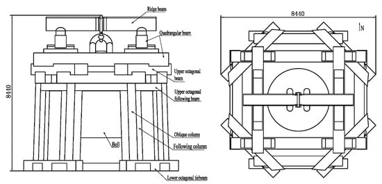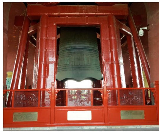 The Bell Tower (Figure 4), located on Di’anmen Outer Street in Dongcheng District, Beijing, China, was built in the 18th year of the Yongle period of the Ming Dynasty (1420) and rebuilt in the 10th year of the Qianlong period of the Qing Dynasty (1745). The bell, which weighs 63 tons, is supported and suspended by an octagonal wooden frame, as shown in Figure 5. Based on the need for protection and maintenance of the Bell Tower, a research team from the Beijing Forestry University conducted an on-site research inspection for wooden elements of the Supporting Wood-Frame, such as columns, beams, and tie-beams [52].