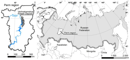 The Verkhnekamskoe potash deposit is located on the left bank of the Kama River in Russia and has an area of about 6.5 × 103 km2 (Figure 1). The ore contains between 18 to 34% KCl [16]. The geological reserve of carnallite is about 96.4 billion tons, sylvinite—112.2 billion tons, halite—4.65 trillion tons. Annual production of potassium–magnesium salts is about 40 million tons.
