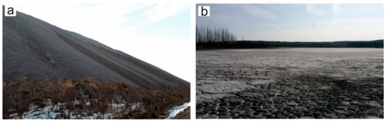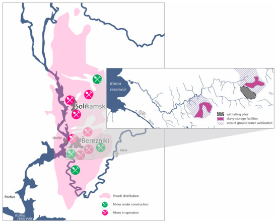 The main source of the environmental pollution in this mining area is uncontrolled discharge of drainage waters of salt tailing piles and salt–clay slurry storage, which were constructed 50–90 years ago. Currently, more than 270 million tons of halite waste and 30 million m3 of salt–clay slime have accumulated in the territory of the Verkhnekamskoye potash deposit [19]. Halite waste with over 90% NaCl is typically placed in piles, while clay slimes and brines drain into storage facilities (Figure 2). Clay–salt slurry contains 35–40% water—soluble salts and 60–65% insoluble clay materials. Brines have a Na–Cl composition and more than 300 g/L of total dissolved solids (TDS) [19]. The territory of the Verkhnekamskoe potash deposit is affected by seven potash mines (Figure 3).