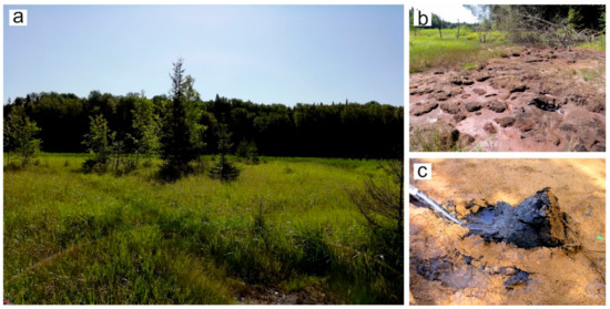 Research into geochemical processes was carried out in the territory of the Verkhnekamskoe potash deposit in Russia (Figure 1), where soil salinisation occurs due to the influence of potash mining. Soil salinisation has been identified in the area that is affected by the sludge storage and salt dumps of the Verkhnekamskoe potash deposit, and bare soils have acquired reddish-yellow iron-rich precipitates on their surface [15]. The presence of brines in the slurry storage facility and salt tailing piles represents the most serious environmental issue in potash mining regions.