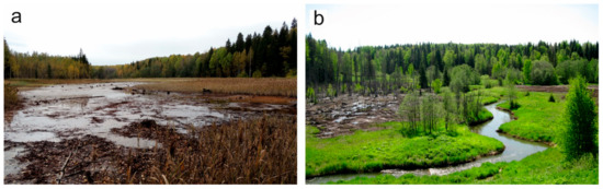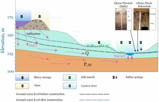 When saline groundwater meets confining beds, it seeps into the surface in the river valleys and pollutes the surface water (Figure 6). The streams have a Ca–HCO3 water type; the salt-affected streams have Na–Cl and Ca, Na–Cl water types. The chloride concentration in the salt-affected streams exceeds the maximum limit (300 mg L−1) recommended for the protection of freshwater life by more than 20 times. The TDS of the river water ranged from 3.4 g/L to 12.9 g/L, and the Cl− concentration in the salt-affected streams was up to 34.6 g L−1. The high K concentration (up to 4.23 g L−1) is attributable to river salinisation caused by the drainage waters of potash mining [22]. The background soil in the researched area is classified as an alluvial grey humic gley soil according to the classification of soils of Russia [21]. While, according to the World reference base (WRB) for soil resources 2014 [31], the soil is called Gleyic Fluvisols (Loamic). Underground mining causes subsidence processes, karst sinkhole formation and an increase in the water table in the surrounding area. The presence of shallow groundwater of the Na–Cl type develops waterlogging processes in the river valley which promotes soil salinity (Figure 6). The presence of dead trees in the river valley indicates that marsh forming developed relatively recently (Figure 8).