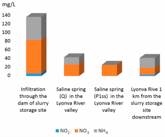 Another indicator of pollution is the high content of nitrogen compounds in drainage water, groundwater and surface water (Figure 7). The NH4+, NO2− and NO3− concentrations exceeded the maximum allowable concentration (MAC) in groundwater by 400, 128 and 3 times, respectively. High concentrations of nitrogen in groundwater were caused by the presence of a wide range of N–bearing heterocyclic compounds in the tailings that were used as flotation reagents [30].