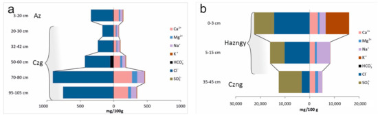 The content of water-soluble ions in: (a) Gleyic Fluvisols (Salic, Loamic, Technic); (b) Chloridic Gleyic Fluvic Solonchak (Hypersalic, Loamic, Technic).