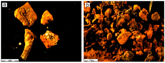 Images of iron-bearing phases: (a) Fe-bearing plant residues; (b) Fe-bearing minerals.