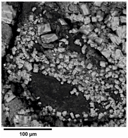 The scanning electron microscope images of the reddish-yellow iron-rich precipitates on the surface of upper soil horizon showed cubic halite crystals, flaky particles, a crust of iron oxides-hydroxides (Figure 11) and spongy residues. The spongy siliceous residues are remains of diatoms and are enriched in Ca, Fe, Cl, K, Na, S, and P (Figure 12).