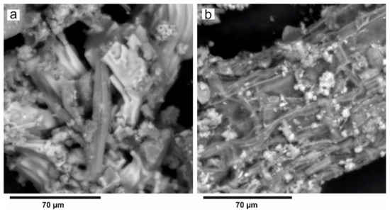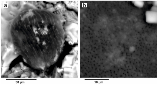 The lower soil horizon (3–30 cm depth) consists of black gel-like phases with a high content of plant residues. The high concentrations of sulphate in the saline waters (Table 2) and microbiological activities led to hydrogen sulphide formation in this horizon (Figure 5). Content of H2S varied from 17 mg/kg, Eh decreased up to −156–−197 which corresponded to a reducible condition. Siliceous remains of diatoms, halite, plant residues and iron-bearing phases were found in samples (Figure 13).