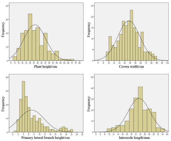 Frequency distribution of plant height, crown width, primary lateral branch height and internode length.