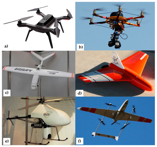 Unmanned aerial vehicle (UAV) types for remote sensing civilian usage: rotary-wing (a,b), fixed-wing (c,d), unmanned helicopter (e), and hybrid solution (f).