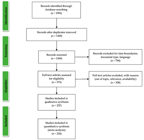 For the eligibility of the screened research papers, the second level of filtering was performed based on the following exclusion criteria: (i) adequacy of the paper topic to the aims of the present review, (ii) mixed criterion accounting for the relevance of publishing source and paper citations, and (iii) scientific paper availability in the research institution’s database. For doubtful cases, the authors re-read the full text of the article and excluded those that did not satisfy the aforementioned criteria. Finally, a total of 226 papers were found to be relevant to the study and therefore are included in the systematic analysis. The overall workflow with single steps and with the related number of selected or excluded papers is reported in Figure 2.