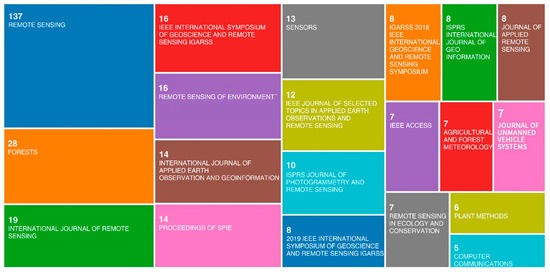 This section reports the results elaborated for the global analysis without going into the specifics of each topic cluster (see Part II). In particular, the authors analyzed scientific production of the period 2018–mid-2020 on the use of UAVs in forestry research in terms of papers’ number, journals, researcher countries, and keywords used. Figure 3 shows the top 20 sources title (journals and proceedings) of research papers filtered only through the exclusion criteria directly available in the WoS search engine (first-step filtering), namely publication year, document type, and language. The Remote Sensing journal (MDPI publisher) turns out to be by far the most popular source title accounting for 23.4% of the publications filtered; then, there are Forests (4.8%—MDPI), the International Journal of Remote Sensing (3.2%—Taylor and Francis), and the International Geoscience and Remote Sensing Symposium Proceedings (2.7%—IEEE Xplore) together with Remote Sensing of Environment (2.7%—Elsevier).