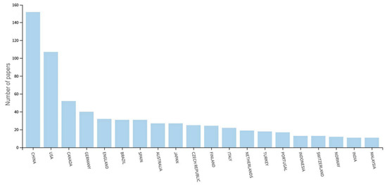 Regarding the top 20 authors’ countries, the bar graph (Figure 4) displays how China and, a step back, the United States of America are the countries that a large share of the researchers who have published on UAVs and forests come from, with 26.5% and 18.4%, respectively. Following these are scientists from Canada (8.8%), Germany (6.7%), and England (5.4%).