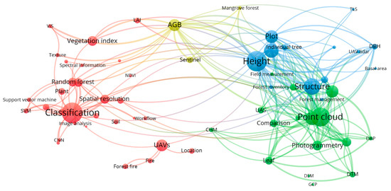 Besides, using the abovementioned first-step filtered database, a scientific mapping of title and abstract keyword occurrences was realized through VOSviewer software [56]. The setting options were tuned as follows: title and abstract field, occurrence full counting method, minimum occurrence threshold equal to 10, and default relevance score (60%). Moreover, to ensure that specific terms strictly related to the use of UAVs for forestry applications were highlighted, some generic words (i.e., work, range, task, etc.) were manually excluded. The network mapping (Figure 5) shows the keyword clustered in four groups with colored lines (max numbers set equal to 200) indicating co-occurrence links between terms. The four groups can be labeled as “classification” (red), “biomass estimation” (yellow), “inventory” (blue), and “UAV imagery”(green) clusters. In the red cluster, the main keywords are all related to image classification both in terms of parameters (“vegetation index”, “texture”, “spatial resolution”) and techniques (“random forest”, “SVM”—support vector machine, “CNN”—Convolutional Neural Network); there is also a sub-group linked to forest fire monitoring where “UAVs” is the most influential term. The biomass estimation cluster is characterized by the keyword “AGB” together with “Sentinel” and “mangrove forest”; this analysis confirmed the high number of papers dealing with biomass assessment in mangrove ecosystems also with the use of other RS platforms, like satellites. “Height”, “structure”, “individual tree” and “plot” are the most frequent occurrences in the inventory cluster, which is strictly related to the remote sensed dendrometric parameters as is also confirmed by other terms like “DBH”—Diameter at Breast Height—“basal area”, “field measurement”, and “forest inventory”. In the green cluster, the fulcrum research keyword of “point cloud” around which there are other UAV imagery products such as “DTM”—Digital Terrain Model—and “DEM”—Digital Elevation Model—or terms related to image processing like “photogrammetry” and “DAP”—Digital Aerial Photogrammetry.