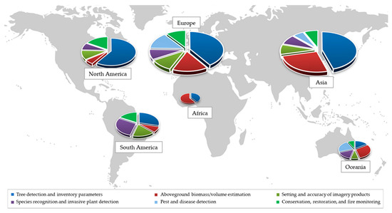 Figure 6 shows a geographic analysis of the dataset. The pie chart size represents the number of research works conducted on the five continents, with the six topics being highlighted in different colors. Each pie chart is centered on the capital city of the country which is at the top rank of the continent. Asia and Europe (including also Russia) are the most prolific continents with 76 and 70 paper, respectively, but, while for Asian research place the applications are more focused on tree detection and inventory parameters, in Europe the scientific works cover a wider range of topics and are split among several countries. In South America, the species recognition topic is well represented (7) thanks to invasive plant detection in the Amazon rainforest. Among continents, North America (which includes also Central America) has the highest incidence (59%) of the tree detection and inventory parameters topic while the 23% of papers from Oceania deal with pest and disease detection. Finally, in Oceania and Africa, UAVs are only used 13 and 5 times, respectively. Regarding nation ranking within each continent, the countries that have hosted the highest number of researches are China (40—Asia), USA (14—North America), Brazil (11—South America), Finland, Spain and Czech Republic (10—Europe), Australia (8—Oceania), and Ghana (2—Africa).