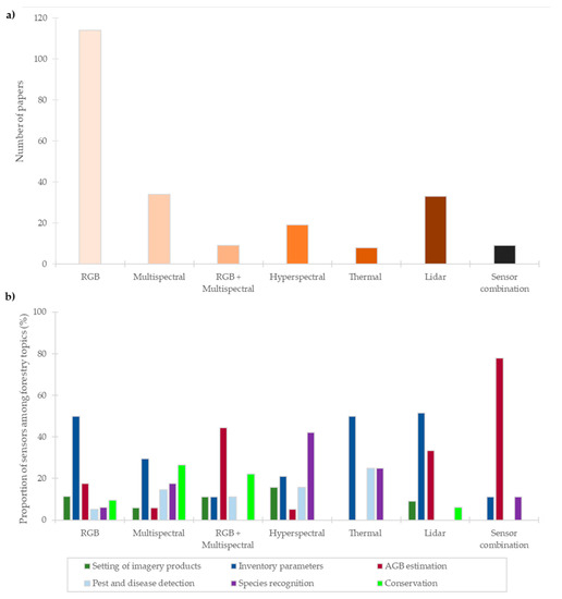 An analysis of the trend in the use of the main UAV-mounted sensors in the reviewed papers is presented in Figure 7. In the process of label creation, for simplicity, cameras sensing separately in the RGB and NIR spectral range are classified as a single multispectral sensor. When thermal and hyperspectral sensors are used in the same study in combination with others, the authors prioritize the abovementioned sensors. Finally, sensor combination expresses the use of both active and passive sensors. RGB, multispectral, and lidar sensors result as the most utilized technologies (Figure 7a): they account for about 80% of the entire dataset, with RGB emerging far from the other types with 114 uses, followed by multispectral and lidar. Deepening the analysis through the forestry topics (Figure 7b), it results that species recognition and invasive plant detection is mainly based on the hyperspectral sensor, while lidar is UAV-mounted in studies exploring tree detection and inventory parameter issues, even if this topic seems to cross all categories of sensors. AGB estimation is tackled especially with RGB, lidar and sensor combination (where lidar is also present). For conservation, restoration, and fire monitoring purposes, multispectral and RGB sensors (and their combination) are the most used, representing 92% of the studies on this topic.