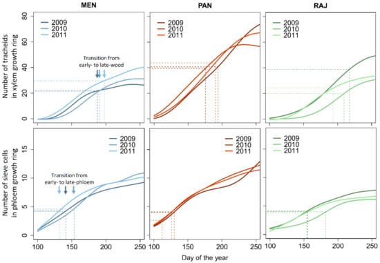 - Cuny, H.E.; Rathgeber, C.B.K.; Frank, D.; Fonti, P.; Fournier, M. Kinetics of tracheid development explain conifer tree-ring structure. New Phytol. 2014, 203, 1231–1241. [Google Scholar] [CrossRef]