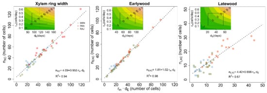 - Cuny, H.E.; Rathgeber, C.B.K.; Lebourgeois, F.; Fortin, M.; Fournier, M. Life strategies in intra-annual dynamics of wood formation: Example of three conifer species in a temperate forest in north-east France. Tree Physiol. 2012, 32, 612–625. [Google Scholar] [CrossRef]