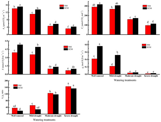 In contrast, the An/gs of both NM and ECM gradually increased with increasing water deficiency. Compared with NM, ECM treatment reduced An/gs under all watering treatments; however, the difference was not significant under the same watering treatments and the increasing range of An/gs of ECM was higher than that of NM when compared with well-watered treatment.