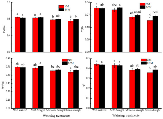 Effects of drought and ECMF on PSII activity. Values (means ± SE) followed by different letters among treatments indicate significant differences (p ≤ 0.05); values with the same letter are non-significantly different for each treatment (p > 0.05). NPQ showed no significant differences among different treatments, so it was not shown.