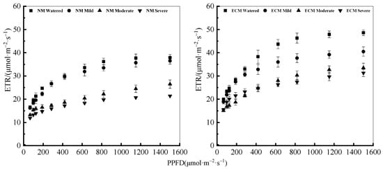 Figure 4 presents the light response curves of ETR (II) of ECM and NM seedlings, which gradually decreased with increasing drought stress. Compared with NM seedlings, S. placidus inoculation resulted in increased ETR (II) under all watering treatments.