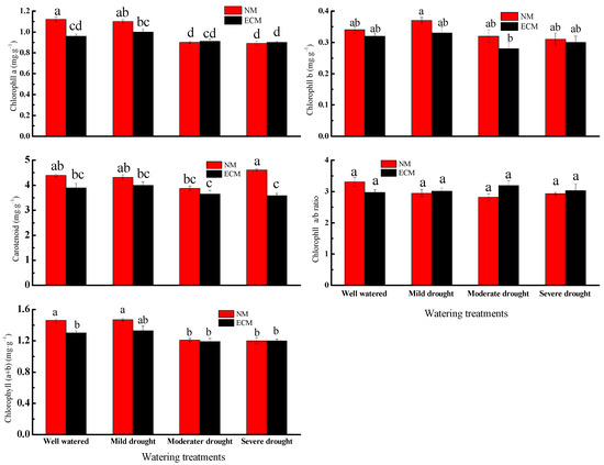 The effect of ECMF inoculation on photosynthetic pigment contents varied with watering treatments, except that the Chl a content under moderate condition, and Chl a/b ratio under mild drought, moderate and severe drought conditions in ECM seedlings were higher than those in NM seedlings, the pigment contents of ECM were lower than NM at each watering treatment (Figure 5).