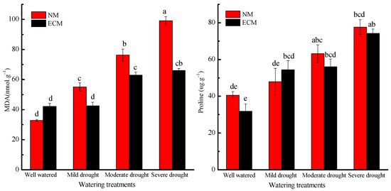 Proline and MDA levels in the needles of both ECM and NM seedlings significantly increased with increased drought stress (Figure 6 and Table S1). The inoculation of ECMF significantly decreased the levels of proline and MDA under drought stress as compared to NM, except the proline level at mild drought.