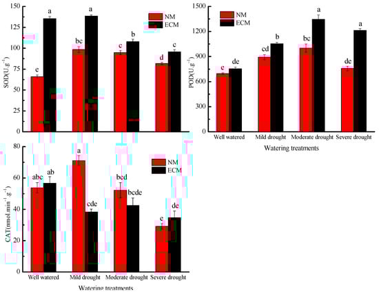 POD and SOD activities in ECM seedlings were significantly higher than those in NM for each watering treatment, while CAT activity was lower under mild and moderate drought conditions.