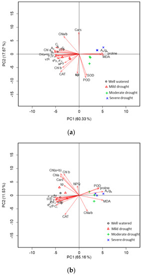 Besides, Figure 8a showed that there was a high positive correlation between POD and SOD, but no close correlation with drought in NM seedlings. On the contrary, there was a significant negative correlation between POD and SOD in ECM seedlings (Figure 8b), and increased POD activity was involved in response to drought stress.