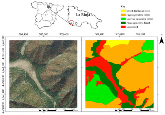 The study area was a 2 × 2 km tile (southwest corner coordinates in UTM: 504,000; 4,660,000) located in La Rioja (Northern Spain, Figure 1). This area was selected due to the availability of data both from the first (2010) and second (2016) PNOA LiDAR coverages. In addition, the vegetation types comprised the full range of seven different FT from the Prometheus classification (Table 1). No forest fires occurred in the study area between 2010 and 2016. In terms of climate, the area selected is mainly continental-Mediterranean (mean annual rainfall: 853 mm and mean annual temperatures: 7.3 °C [58]). Given its topography and characteristic geographical situation, it hosts a great diversity of microclimates and ecosystems. The vegetation is mainly composed of meso-xerophilous oak, beech, and pine forests. The most representative species are Quercus ilex ssp. ballota, Quercus pyrenaica, Quercus petraea, Fagus sylvatica, and Pinus sylvestris [59]. The forest vegetation cover types and the orthophoto of the study area are shown in Figure 1.