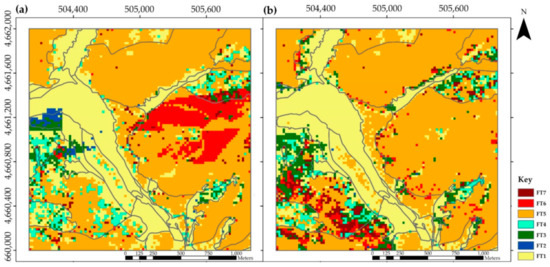 In change analyses carried out post-classification, error matrices such as those in Table 3 and Table 4 are a common endpoint of accuracy assessment [65]. However, Olofsson et al. [65] showed that these single date error matrices do not provide information relevant to assess the accuracy in change identification. Thus, the matrix in Table 5 is a summary of the vegetation structural changes using LiDAR between 2010 and 2016 in an area that contains the FTs typically found in Mediterranean ecosystems. Our analysis, however, does not directly evaluate the capacity of this method to detect changes. We nonetheless have an indication of potential to detect vegetation changes in a relatively short period (6 years). Analyzing vegetation changes using Prometheus FTs revealed that, while most of the area persisted as stable forest types, especially forest without understory (FT5) and pastures (FT1), many other areas showed significant changes between 2010 and 2016, hence the relevance of analyzing the changes of FTs. We observed changes of ecosystem development due to vegetation growth from lower to higher vegetation strata (13.7%; Figure 3; Table 5), sometimes even reaching the tree stratum with processes of forest expansion occurring at edges of forested vegetation types. These changes could be experienced not only because of a vertical growth, but also because of a growth in width so the canopy cover increases, and it surpasses the threshold of 50% of canopy cover to be considered as a forested FT. Other reasons could be that the increase in scan density allowed us to make a more precise estimation of the canopy cover, or it can also be just an error in the classification. Understory growth was frequently observed in the interior of oak forests (Figure 4; Table 7), and also at the border of pine and beech forests as ecotone changes. Special attention should be paid to these areas, where the fuel hazard has considerably increased over the time span between the two datasets, due to the growth of the shrub stratum that may lead to vertical continuity and crown fires [69]. Only few of the changes observed were due to forest loss (0.48%), for instance changes from forested FTs to pastures (FT1) or shrubs (FT2-4), which were mainly observed on pine forests (Figure 3a). These cells classified as forest loss may be interpreted as an error in the classification given that there are not forming patchy structures and because of the few number of cells classified as forest loss. The 11.8% decrease in understory proportion (grey areas in Figure 3a), which was observed in some beech areas, may be a result of the closure of the tree canopies inhibiting the growth of the understory (Table 7). Regarding the transitions from shrub FTs (FT4, FT3, and FT2) to pastures (FT1), they might be the result of grazing, droughts that could affect shrub density, or survival or large-sized herbaceous vegetation, which the classification algorithm interprets as small-sized shrubs.