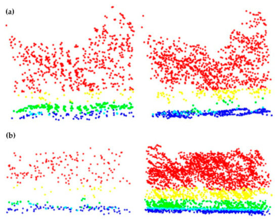 Comparison of a vertical vegetation profile between 2010 (left) and 2016 (right) in a same cell. (a) Shows how a vegetation profile changed from forest with shrubs (FT6) in 2010 to forest with no understory (FT5) in 2016. (b) Displays the transition from forest with no understory (FT5) in 2010 to forest with vertical continuity (FT7) in 2016. Colors signify strata: above 4.0 m (red), 2.0–4.0 m (yellow), 0.6–2.0 m (green), 0.3–0.6 m (light blue), or below 0.3 m (dark blue).