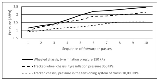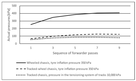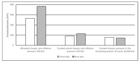Figure 5). Taking into account the maximum values of actual pressures reached, exceeding the values of specific pressures were even higher—by up to 203% in the wheeled chassis and tracked chassis, and by up to 218% in the tracked-wheel chassis. The tracked-wheel chassis exhibited the highest values of exceeded specific pressures, both average and maximal ones. The fact is probably associated with the inappropriately designed methodology for establishing the contact area of the tracked-wheel chassis with the soil surface and with the uneven distribution of machine weight on the entire area of tracked wheels (different loading in sections under wheels and between the wheels). When the cargo space of the wheeled forwarder was loaded with a weight, actual pressures recorded on the front and rear axles during the machine travel were higher by 142% and by 283%, respectively. The different tire inflation in the wheeled chassis (150 kPa and 350 kPa) of the loaded forwarder succeeded in reducing the induced actual pressures by up to 45%. The range of reached maximum actual pressure values was from 99 kPa on the rear axle of the forwarder without load up to 437 kPa on the rear axle of the machine with a load, according to the degree of tire inflation.