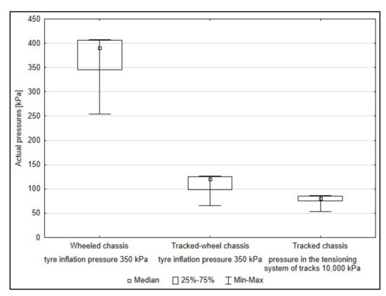 The course of induced actual pressures of rear axles in the respective forwarder chassis variants with the load was evaluated by Kruskal–Wallis test. Statistically significant differences were found between wheeled and tracked-wheel chassis and between wheeled and tracked chassis,