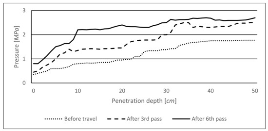 Figure 8 illustrates the increasing soil profile penetration resistance after the third and the sixth pass of the wheeled forwarder with the load of 4185 kg on the Eutric Cambisol soil type. Our measurements showed that the soil profile penetration resistance was increasing during the first six passes of the wheeled forwarder; then the trend of increasing values of the penetration resistance of the soil profile was not so intensive (
