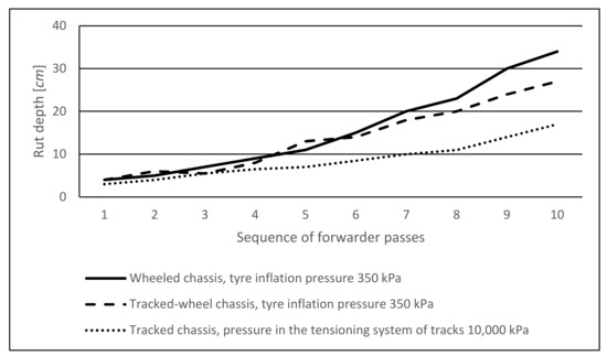 Figure 10 illustrates the development of rut depth in the loaded forwarder with the wheeled, tracked-wheel, and tracked chassis types. The maximal rut depth after the tenth pass was reached in the wheeled forwarder variant (34 cm). A more intensive deepening of the rut occurred in the soil profile after the fifth pass of the forwarder wheeled chassis. At that moment, the upper layer elasticity was probably disturbed in the soil profile. On wet, soft, and shallow peat soils, Neri et al. [