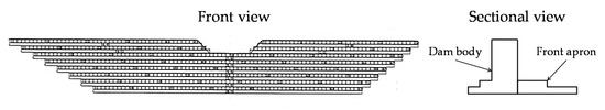 The subject region, as in our previous study [19], was Akita Prefecture in Japan. The subject timber dam (Figure 1a) (length 30.6 m; height 3.0 m; lumber consumption 241.8 m3; amount of sediment runoff prevented 602 m3) was built in Kitaakita City, Akita Prefecture, in FY2013. The tree species used in the timber dam is Japanese cedar (Cryptomeria japonica D. Don) lumber from Akita Prefecture. Figure 2 shows the front and sectional views of the timber dam. We compare it with a concrete dam (Figure 1b) (length 20.0 m; height 6.0 m; lumber consumption 10.5 m3; concrete consumption 237.5 m3; amount of sediment runoff prevented 320 m3), which was built in Yurihonjo City, Akita Prefecture, in FY2018. Both dams were ordered by the Akita Prefecture as public works.