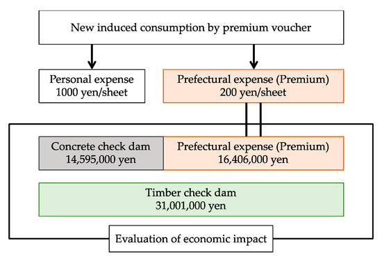 When the functions (amounts of sediment-runoff prevention) of the timber dam and the concrete dam examined in this study are unified, the construction costs are different, and the concrete dam is cheaper. We considered this difference to be available to the government (Akita Prefecture) for other regional promotion measures. Therefore, in order to take account of both functions and costs when comparing timber and concrete dams, this study evaluated the regional economic impact due to induced consumption when the difference in costs is made available to regional residents as government-issued premium vouchers (Figure 3).