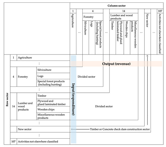 Figure 4 shows a schematic of the extended input–output table. We used the 2015 Akita Prefecture Input–Output Table (henceforth Akita table) [22], which is the latest input–output table for the prefecture, to evaluate the economic impact. In the Akita table, the industrial sector was divided into 107 sectors. There are only two categories in the forestry and wood industry, the lumber and wood products sector and the forestry sector. However, the wood used for timber dam construction (mainly lumber used as the main material) and the wood used for concrete dam construction (mainly plywood used for the formwork) are different. In addition, the forestry sector in the Akita table includes special forest products (including those related to hunting). The classification is thus too broad to evaluate the economic impact on the forestry and wood industries in detail. Therefore, using the “basic sector table” [23] and “107 sector table” [24], the lumber and wood products sector was divided into timber, plywood and glued laminated timber, wooden chips, and miscellaneous wooden products; while the forestry sector was divided into silviculture, logs, and special forest products (including hunting). In the case of the lumber and wood products sector, the ratio of timber, plywood, and glued laminated timber, wooden chips, and miscellaneous wooden products sectors to the domestic production in the lumber and wood products sector in the basic sector table was calculated, and it was multiplied by the prefectural production in the lumber and wood products sector in the Akita table. The forestry sector in the Akita table was also divided in the same way using the ratio of the silviculture, logs, and special forest products (including hunting) sectors to the forestry sector in the basic sector table. However, in order to unify the number of row and column sectors, the sector of wooden products for construction and the sector of wooden products not elsewhere classified were compounded as a miscellaneous wooden products sector. The extended input–output table was developed by creating a timber or a concrete dam construction sector and dividing the lumber and wood products sector into timber, plywood and glued laminated timber, wooden chips, and miscellaneous wooden products sectors and the forestry sector into silviculture, logs, and special forest products (including hunting) sectors, for a total of 113 sectors.